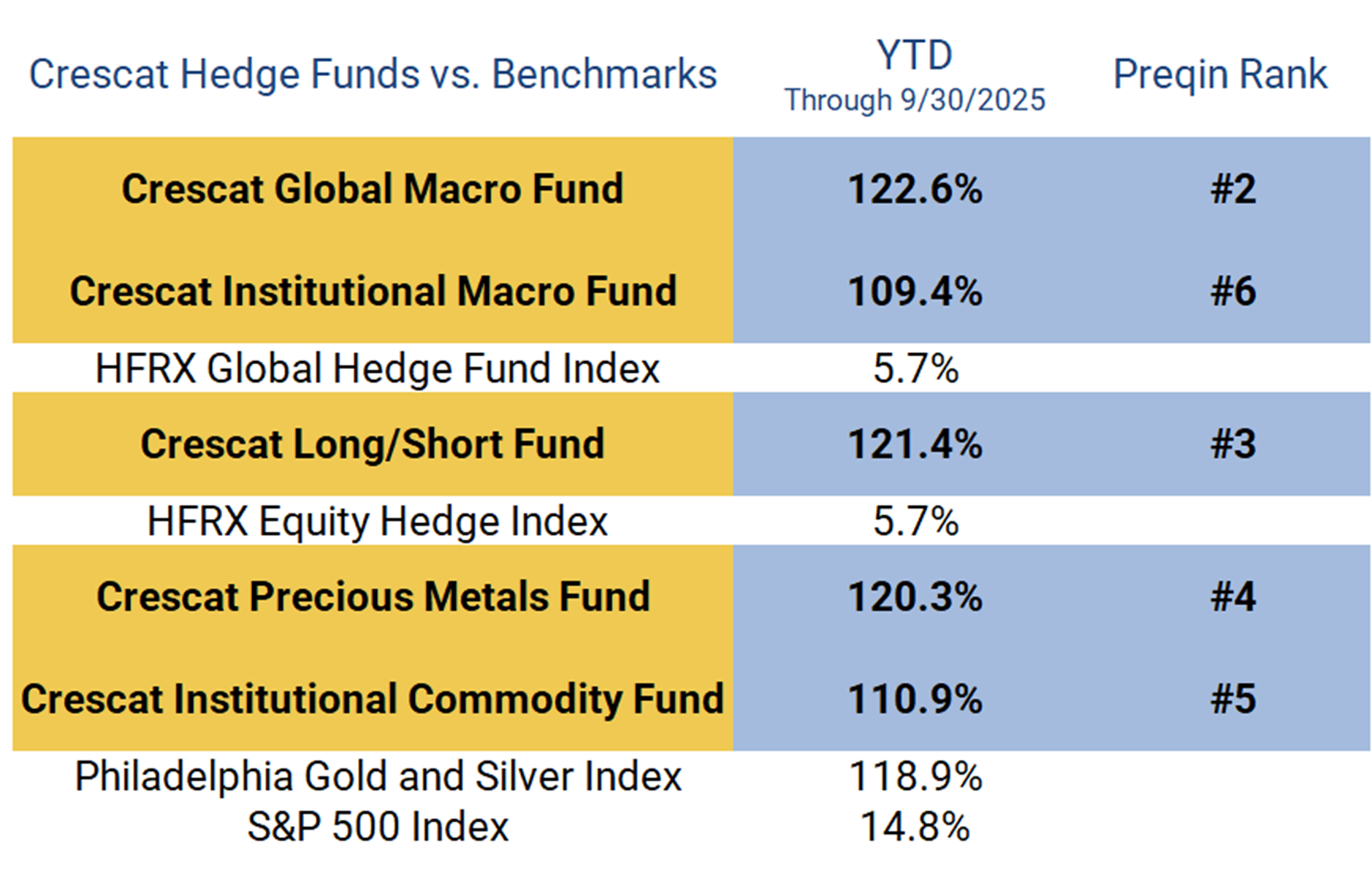 Crescat is having an outstanding year. All 5 of our funds rank in the top 10 among 483 hedge funds in the Preqin database for 2025 year-to-date performance through September 30, 2025. Click Here.